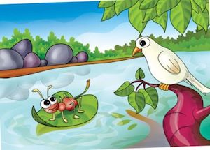 She could have drowned if a dove up a nearby tree had not seen her. Seeing that the ant was in trouble, the dove quickly plucked off a leaf and dropped it into the water near the struggling ant. The ant moved towards the leaf and climbed up there. Soon it carried her safely to dry ground.